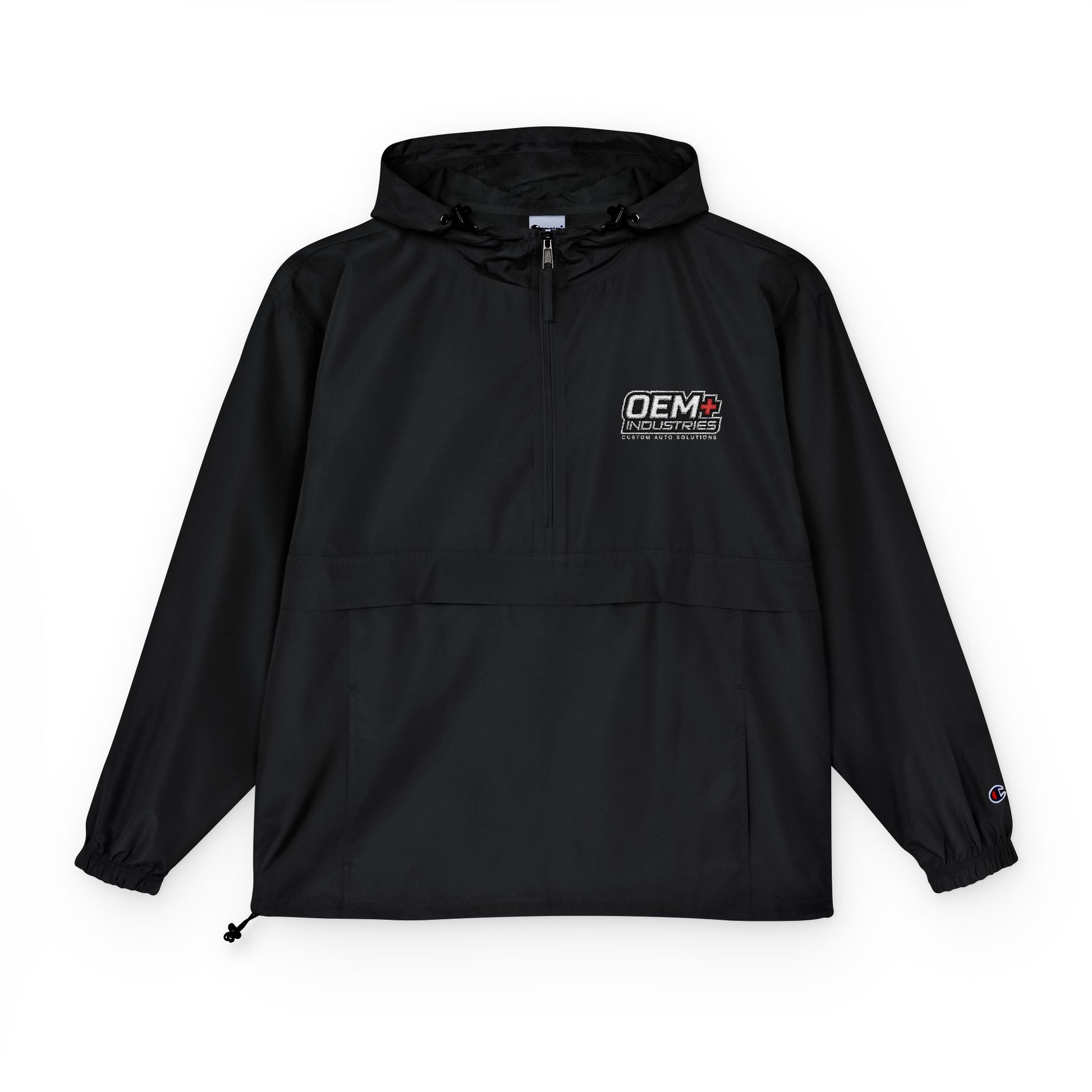 Our signature OEM+ rain jacket/windbreaker, embroidered on a high quality Champion garment. This water resistant jacket with a scuba collar and hood provides 360 degree protection from wind and rain. Perfect for staying dry in low to moderate rain, it can be self-packed into its front pocket for a compact carrying experience. Ideal for outdoor enthusiasts, hikers, and travelers. Great for rainy days, camping trips, and outdoor adventures.